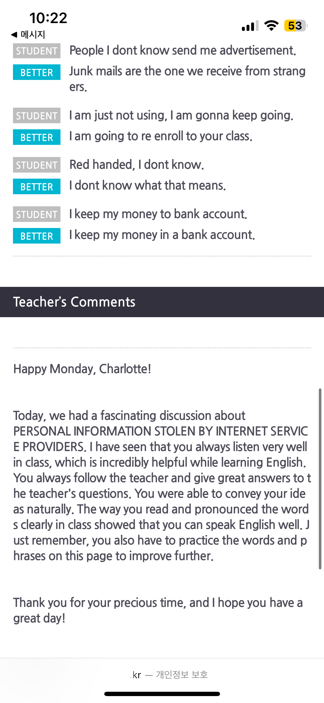 안녕하세요 회원님^^ 담당 강사님과 3개월동안 꾸준히 수업참여해주셔서 감사합니다. 처음에는 긴 문장 말하기에 어려움을 겪기도 하셨지만 점차 읽는 속도도 빨라지고 쉽게 이해하게 되시면서 회원님만의 학습습관이 잘 자리잡히신 것 같습니다. 앞으로도 수업을 통해 배운 표현들 일상에도 잘 활용하시면서 더욱 자연스럽고 자신감있게 영어 구사하시길 함께 응원하겠습니다! 감사합니다♡