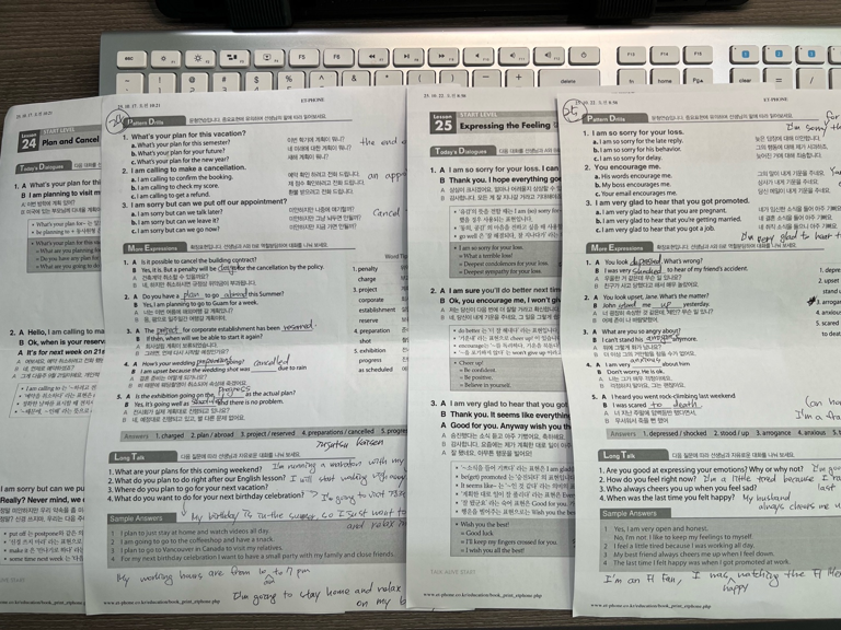 4. 수업 전 후 예습, 복습을 하고 있어요. - 예습하면서 작문을 해보고, - 복습하면서 프리토킹때 완성도가 떨어졌던 문장을 다시 작문을 하고, 일 피드백을 확인하며 복습합니다.