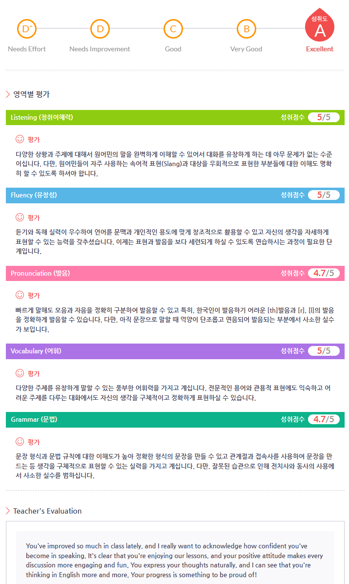 안녕하세요. 수강 초기에는 스스로 영어에 대한 자신감 부족과 표현의 어려움이 있었으나, 꾸준한 수업 참여를 통해 점차 개선되는 모습을 직접 체감할 수 있었습니다. 특히 이번 학습 평가 결과에서 성취도 A(Excellent) 등급을 받게 되었고, Listening·Fluency·Vocabulary는 5점 만점, Pronunciation·Grammar는 4.7점이라는 우수한 점수를 받을 수 있었습니다. 원어민 강사님께서도 수업 태도와 성장 속도를 높게 평가해 주셨으며, 영어적 사고의 자연스러움과 자신감 있는 표현이 크게 향상되었다는 피드백을 전달해 주셨습니다. 수업을 통해 변화된 점은 다음과 같습니다.