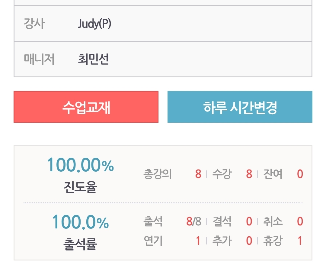 좋은 후기 정말 감사합니다! 😊 화·목 저녁마다 꾸준히 참여해 주시는 만큼, 수업에서의 성장도 확실히 느껴지시는 것 같아요. Judy 선생님 수업을 즐겁게 받아 주시고, 자신감까지 높아지고 있다니 저희도 정말 기쁩니다. 앞으로도 선생님과 함께 더 큰 성장을 하실 수 있도록 관리 도와드릴게요! A 평가까지 같이 열심히 달려봐요 💪✨