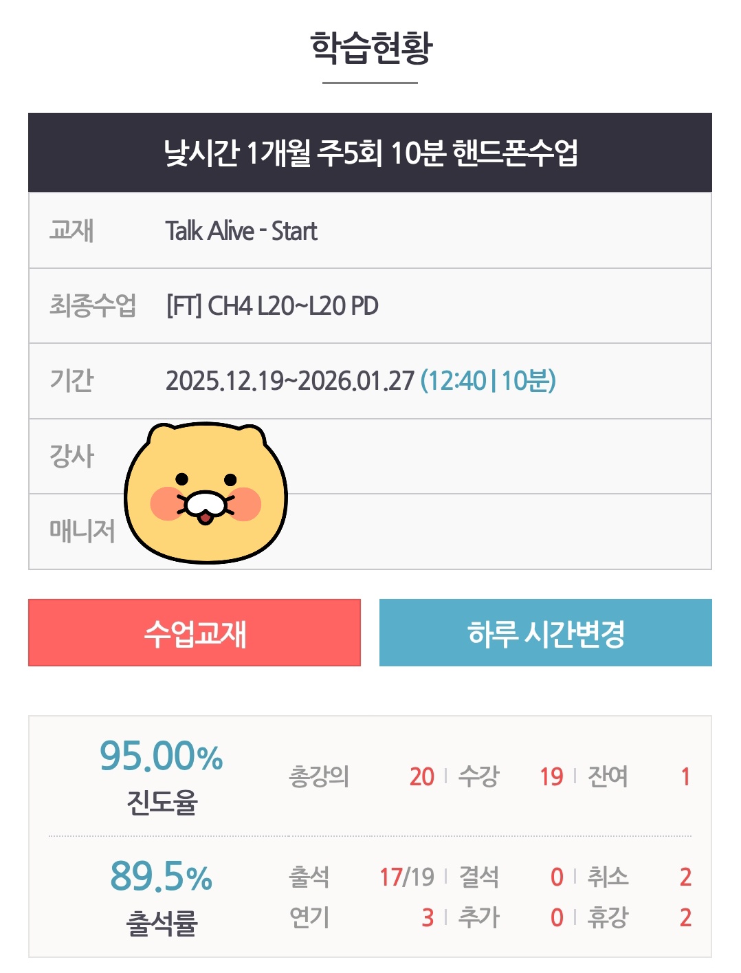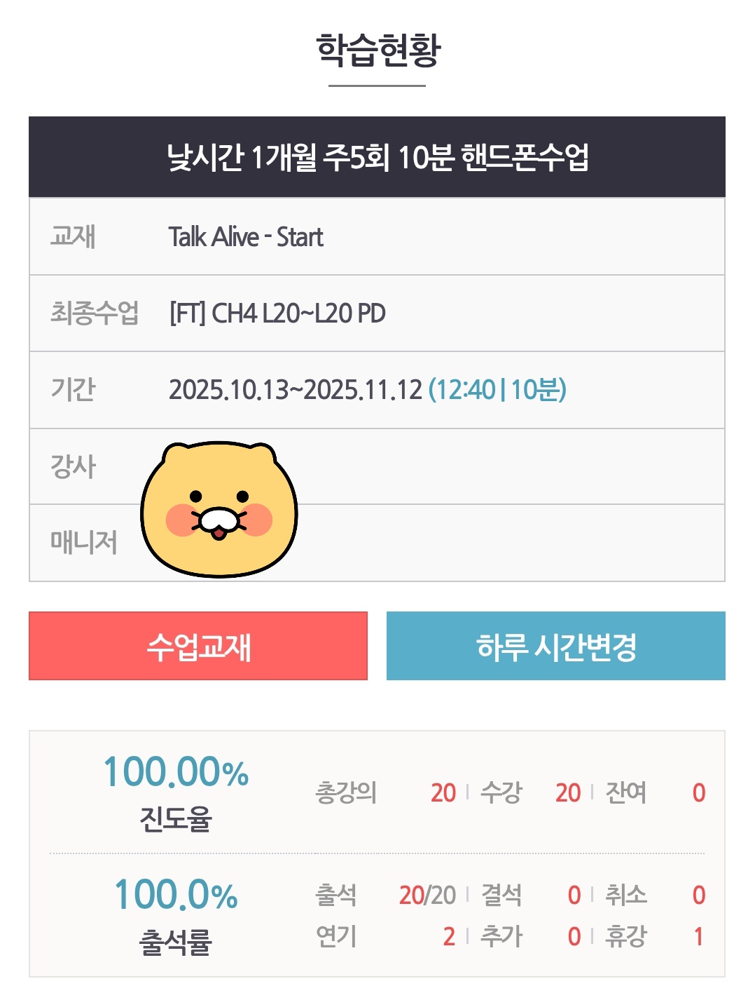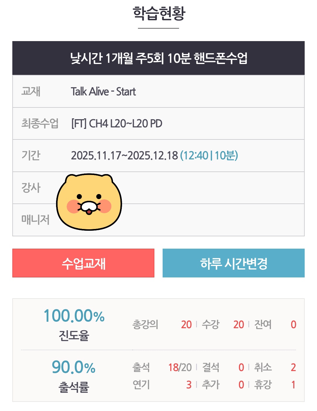 안녕하세요 회원님^^ 출석률 93% ! 꾸준히 수업 참여해주셔서 감사드립니다. 3개월이란 긴 시간동안 꾸준히 수업 참여해주시고 습관화 만드신 점 또한 멋지신 것 같아요. 강사님과 수업시간에 일상에 대한 자연스러운 대화도 하게 되시고 재미있게 수업 잘 진행 중이신 것 같아 저희도 기쁩니다. 앞으로도 강사님과 유익하고 즐거운 수업 잘 이어가시길 응원할게요! 감사합니다♡
