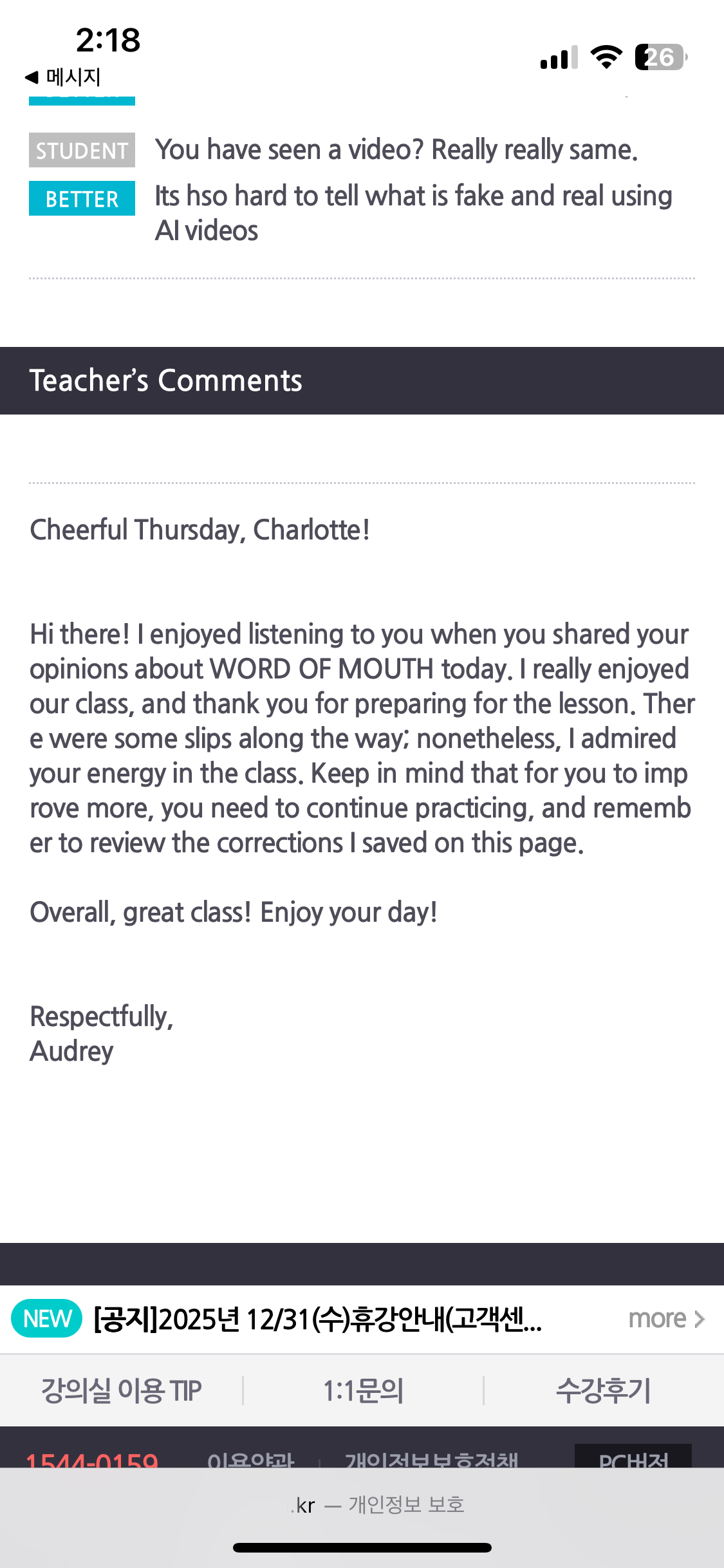 audrey쌤에게 20분 주2회 배우고 있습니다. 선생님도 밝으시고 제가 잘 못 알아들으면, 천천히 또박또박 알려주시거나 텍스트를 화면에 띄어주셔서 부담이 덜합니다. 발음이 이상한 거는 바로바로 알려주셔서 좋았어요. 수업이 끝난 후에도 수업시간에 말씀 못 해주셨던 문법과 발음 교정도 더 추가해서 코멘트 주십니다. 수업 영상이 녹화가 돼서 복습할 때 도움이 됩니다. 잘 발음하고 있다거나, 꽤 빠르게 말하고 있다고 생각했는데 녹화본 다시 보면 발음을 흘리거나 부족한 것들이 바로바로 보이더라고요. 부족한 게 많아 의기소침해질 때마다 선생님께서 너무 잘하고 있다고 칭찬해주시니 더 열심히 하게되는 거 같아요. 주제글을 읽고 7개 질문에 답하는 방식으로 수업을 합니다. 7개 질문을 바로바로 영어로 답하는 게 아직 좀 어려워서, 첨부한 사진처럼 전날에 미리 본문을 읽고 대충으로라도 답을 써놓고 수업 할 때 말을 더 붙여서 답하곤 합니다. 수업이 좀 빨리 끝나면 남는 시간에는 자유롭게 얘기하는데 늘 따뜻한 말씀을 해주셔서 힐링이 되네요. 서로 알아가는 재미도 있고요, 미국 선생님 수업은 어떤지 모르겠지만 필리핀 강사 선생님도 좋은 거 같아요. 발음도 좋고 오히려 또박또박 말씀해주셔서 초보 입장에선 더 잘 들릴 것 같습니다. 5개월차에 이르니 영어로 말하는 것에 대한 두려움은 없습니다. 다만 좋은 숙어, 좋은 표현 방법, 단어들을 스스로 공부하지 않는다면 실력은 제자리인 거 같아요. 수업 후 복습하고 좋은 표현들은 다음 수업 때 써먹어보는 자세가 중요할 것 같네여 |
