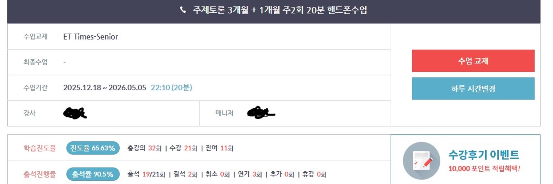 그럼에도 불구하고, 집중해서 시간을 투입한 날의 수업은 확연 히 다르게 느껴졌습니다. 사전에 준비를 하고 복습까지 이어진 경우에는 말하기의 흐름이 훨씬 자연스럽고 자신감 있게 이어 졌으며, 수업 자체에 대한 만족도 또한 높아지는 것을 체감할 수 있었습니다. 결국 영어 학습은 투자한 시간과 집중도에 정비례 한다는 것을 다시 한번 느낀 한 달이었습니다. 또한 단어나 기본 적인 문법 역시 꾸준히 반복하고 점검하지 않으면 쉽게 흐트러 진다는 점을 체감하며, 기초의 중요성을 다시 인식하게 되었습 니다. 3월 한 달을 정리해보면, 아쉬움과 함께 방향성을 다시 잡게 된 시간이었던 것 같습니다. 부족했던 부분을 명확히 인지한 만큼, 다가오는 4월에는 더욱 집중하여 예습과 복습을 철저히 병행하 고, 학습의 밀도를 높이는 데 초점을 맞추고자 합니다. 조급함보 다는 꾸준함을 바탕으로, 보다 만족스러운 수업을 만들어 가는 한 달이 되도록 노력하겠습니다. 그와함께 선생님이 매번 수업후 정리해주시는 피드백에 대해서도 철저히 복습하여 내것으로 만들고자합니다. |