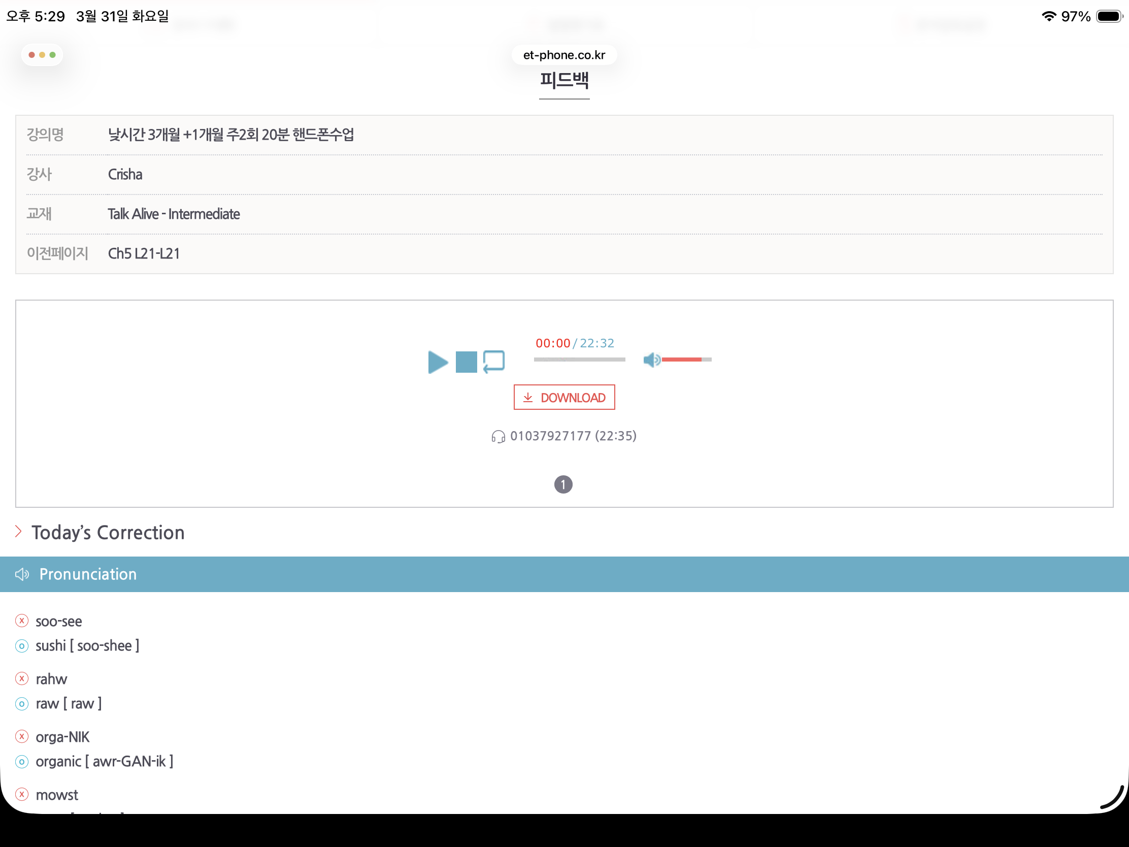 전화영어를 시작한 지 얼마 되지 않았지만, 전반적으로 꽤 만족하면서 수업을 듣고 있어요. 가장 좋았던 점은 수업이 생각보다 체계적으로 진행된다는 거였어요. 매번 비슷하게 흘러가는 게 아니라, 간단한 스몰토크로 시작해서 그날의 주제에 맞는 표현을 배우고, 직접 말해보는 시간이 자연스럽게 이어져서 부담 없이 참여할 수 있었어요. 특히 피드백이 구체적인 게 정말 도움이 많이 됐어요. 그냥 “좋아요” 하고 넘어가는 게 아니라, 제가 말하면서 틀린 부분이나 더 자연스럽게 바꿀 수 있는 표현을 바로바로 짚어줘서 복습할 때도 훨씬 수월했어요. 예문도 같이 알려주니까 다음에 비슷한 상황에서 바로 써먹을 수 있는 느낌이라 좋았고요. 처음에는 영어로 말하는 게 조금 어색하고 긴장됐는데, 수업을 몇 번 하다 보니까 점점 입이 트이는 느낌도 들어요. 아직 엄청 유창해졌다고 말하기는 어렵지만, 적어도 영어로 말하는 것에 대한 부담은 많이 줄어든 것 같아요. 무엇보다 선생님이 편하게 이끌어줘서 실수해도 괜찮다는 분위기가 있는 게 큰 장점이에요. 그래서 더 적극적으로 말하게 되고, 그만큼 배우는 것도 많아지는 것 같아요. 꾸준히 하면 더 좋아질 것 같아서 앞으로도 계속 해보려고 해요.