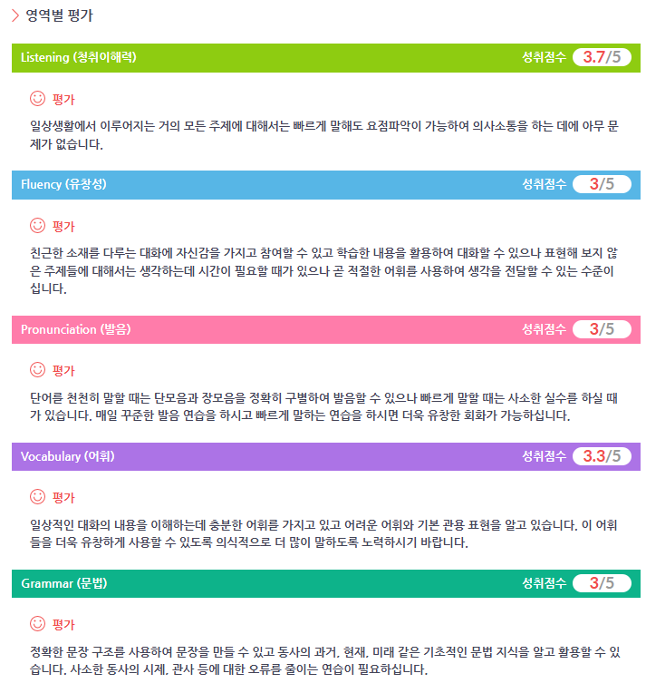 안녕하세요 회원님^^ 4개월동안 꾸준히 수업 참여해주셔서 감사합니다. 예복습이나 글쓰기 학습까지 확장하시면 회원님만의 학습습관이 잘 자리잡으실거라 생각됩니다. 앞으로도 강사님과의 수업을 통해 조금씩 자신감이 쌓이면서 더욱 즐겁게 영어 구사하게 되시길 응원하겠습니다. 감사합니다♡