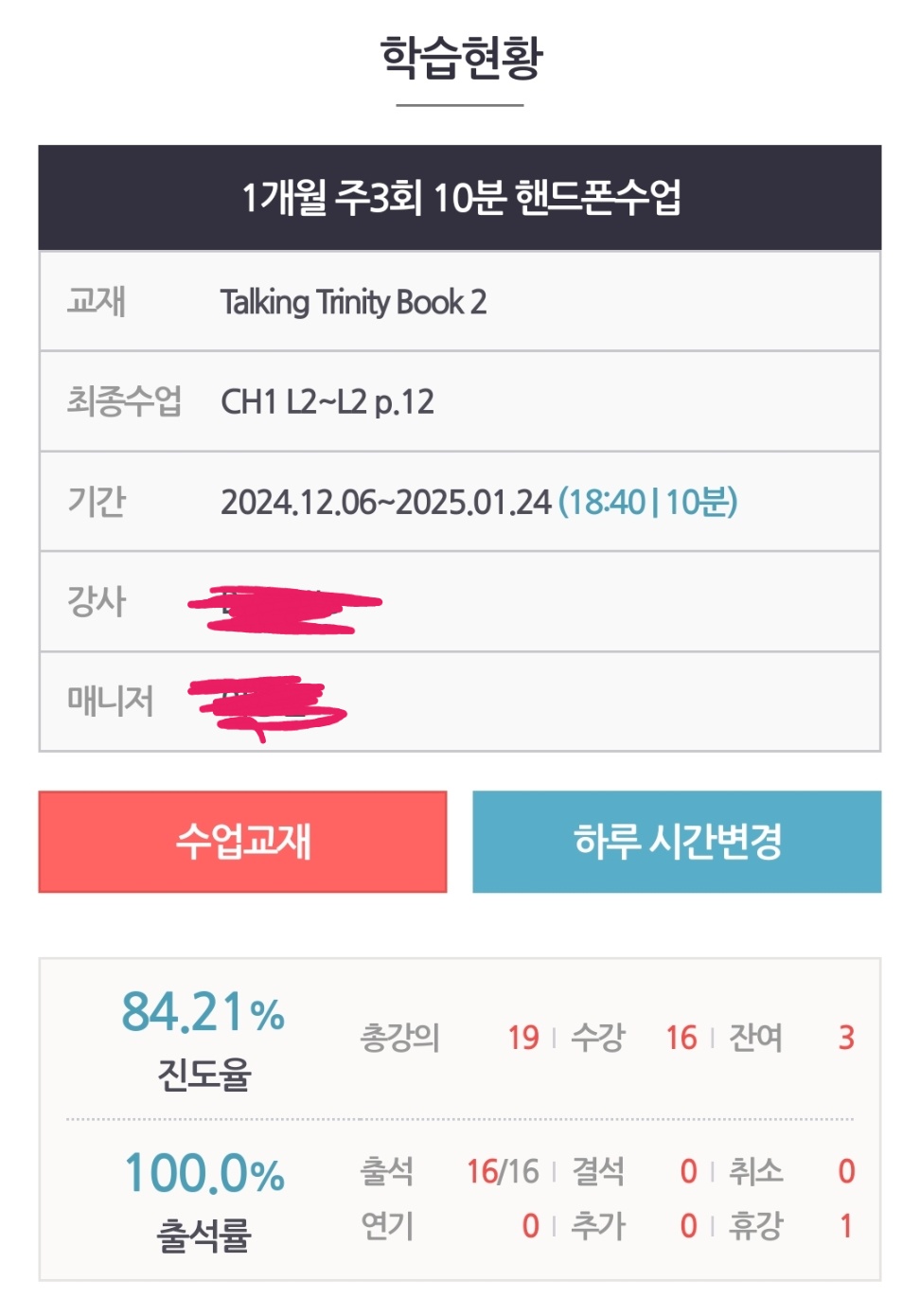 안녕하세요 정서원 회원 어머님~ 수업후기 올려주셔서 감사합니다~ 고작 10분이지만 꾸준히 사용하는 습관과 기억을 심어주시는게 생각보다 효과가 좋습니다 1~2시간을 매일 학원 가서 공부를 하더라도 , 정작 사용할 기회가 아이들한테 주어지지 않는다면 우리들 기성세대 처럼 말 한마디 못하고 답답한 시간을 가지게 될 것입니다 너무 좋은 경험을 아이들한테 어머님이 만들어주고 계십니다 감사합니다^^ 설 명절 잘 보내세여 !!