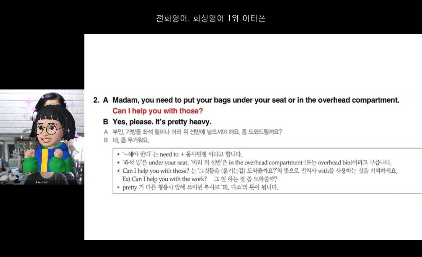 안녕하세요 회원님^^ 바쁜 일정 가운데에서도 수업 꾸준히 참여해주셔서 감사합니다. 회원님 눈높이에 맞춘 수업을 통해 영어 울렁증을 점차 극복해가시길 저희도 함께 응원하겠습니다! 감사합니다♡
