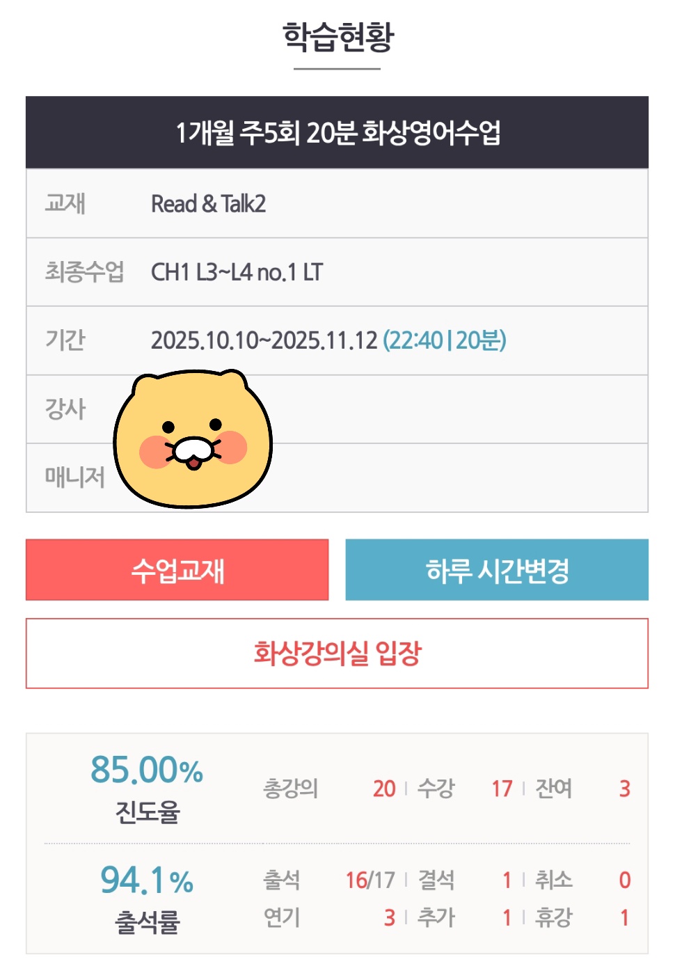 Read & Talk 과목을 수강하면서 느낀 좋은 점은! 매일 책을 읽고 그 주제에 맞춰 자연스럽게 내 생각을 말하며 대화를 이어갈 수 있었다는 점입니다. 단순히 주어진 문장을 따라 말하는 방식이 아니라, 매 수업이 나만의 의견과 경험을 중심으로 진행되다 보니 훨씬 더 재미있고, 말하기 실력도 빠르게 늘어나는 느낌이 들었습니다. 또한, 매일 같은 시간에 같은 선생님과 꾸준히 수업을 이어갈 수 있다는 점도 너무 좋았어요!! 매일 같은 선생님과 얼굴을 보며 이야기하다 보니, 마치 친구와 대화하는 듯한 편안한 분위기가 형성되어서 영어로 말하는 것에 대한 부담감이 많이 줄어드는 것 같아요!! 그리고 또 하나 좋았던 점은 수업 시간대가 정말 다양하다는 거예요. 저는 현재 22시 40분~23시에 수업을 듣는데, 다른 일정과 겹치지 않은 시간에 영어수업을 들을 수 있다는 것이 정말 좋았어요. 평소에 근무, 학원, 친구와의 약속 등으로 바쁘다보니 꾸준히 영어를 이어나가기 쉽지 않은데, 이렇게 늦은 저녁 시간에도 수업이 가능하니까 포기하지 않고 꾸준히 학습할 수 있었습니다!! 수업을 꾸준히 하다 보니, 교재의 주제에 대해 미리 생각을 정리하고 오면 수업 효과가 훨씬 커진다는 걸 깨달았습니다. 현재는 매일매일 해당 시간에 맞춰서 수업듣는것에만 급급하지만ㅋㅋ 지금은 나름 학습 습관이 잡혀있으니!! 다음 달에는 “매일 책의 주제에 맞춰 나만의 의견을 미리 정리해봐야지!!” 하는 나름의 다짐(?)을 가지고 있답니다. Read & Talk 과목은 특히나 미리 어느정도 의견을 생각해놓는게 시니어 레벨2단계에서는 도움이 많이 될 것 같아요!!