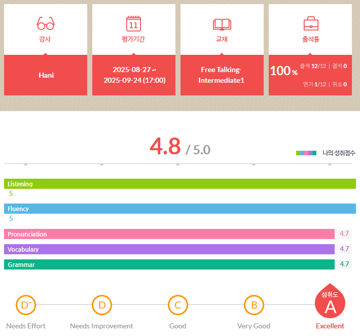 회사생활을 하다 보면 영어의 필요성을 느끼는 순간이 정말 많습니다. 해외 메일 하나를 쓸 때도, 간단한 미팅에서 영어로 자기소개를 해야 할 때도, ‘좀 더 자연스럽게 말할 수 있으면 좋겠다’는 생각이 늘 들었어요. 그런 마음으로 시작한 게 바로 이티폰이었습니다. 사실 처음엔 매일 영어로 대화한다는 게 쉽지 않았습니다. 업무가 바쁘고 피곤한 날엔 수업을 미루고 싶을 때도 있었죠. 그런데 이티폰은 이상하게 “한 번만 더 해보자”는 마음이 들게 하는 프로그램이었습니다. 시간이 지나면서 제 영어에 작은 변화들이 생겼습니다. 이번 평가 결과에서 총점 4.8점 / 5.0점 (Excellent) 을 받았고, Listening과 Fluency는 만점, 나머지 항목들도 모두 4.7점으로 꾸준한 성장을 보였습니다. 출석률 100%를 기록한 것도 제 자신에게는 큰 의미였습니다. 회사일을 병행하면서 이렇게 꾸준히 무언가를 이어간다는 게 쉽지 않거든요. 하지만 Hani 선생님의 친절하고 꼼꼼한 피드백 덕분에 포기하지 않고 계속 도전할 수 있었습니다. 수업을 통해 배운 건 단순히 영어 실력만이 아닙니다. 틀려도 괜찮다는 자신감, 완벽하지 않아도 소통할 수 있다는 용기였습니다. 예전에는 영어로 말하는 게 두려웠지만, 지금은 ‘전하고자 하는 마음’이 우선이라는 걸 알게 되었습니다. 덕분에 회의나 이메일에서도 훨씬 자연스럽게 제 생각을 표현할 수 있게 되었어요.