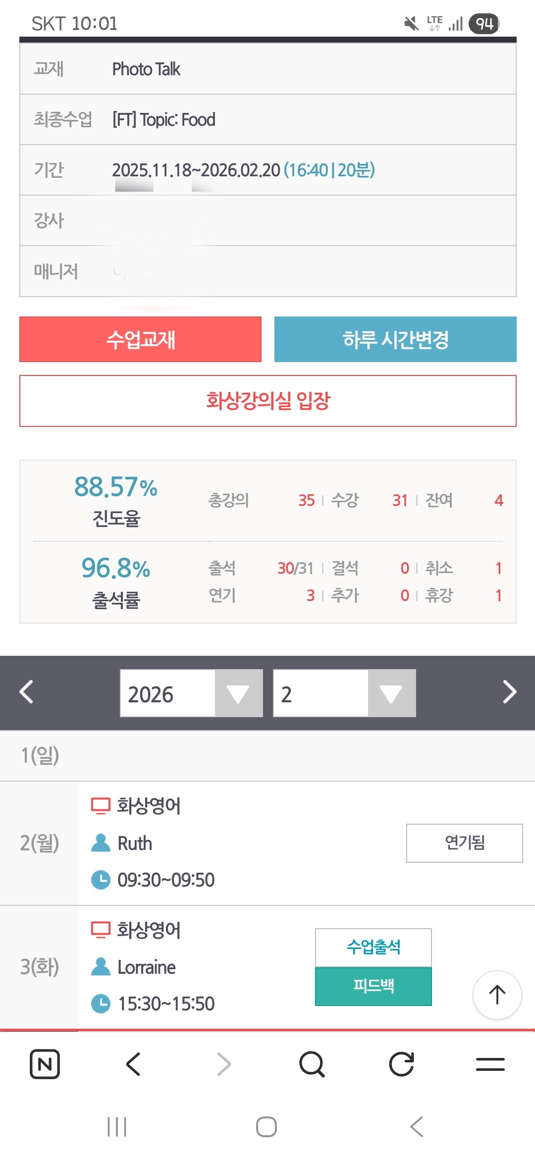 참 많이도 강사님들을 만난것도 같습니다....^^ 수강한 시간에 비해서는..... 제가 소심하기도 한 탓이겠죠~^^; 여하튼.. 이번에는 제게 딱 맞는 에너제틱한 강사님을 배정 받았는데 영어공부다.... 라는 생각을 조금을 접고 수업에 즐겁게 참여하는걸 목적으로 삼아 보려고요~^^